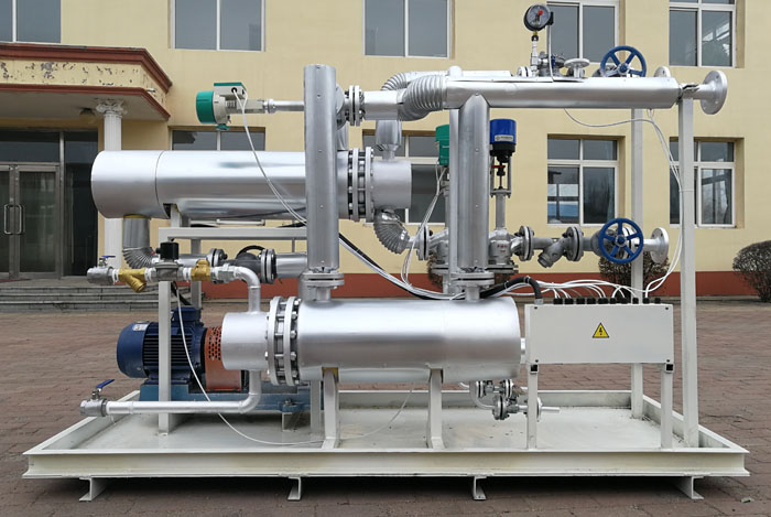 工作原理:將高溫熱源換熱給低溫有機熱載體或高溫有機熱載體混入低溫有機熱載體已達到用熱設(shè)備的溫度要求。