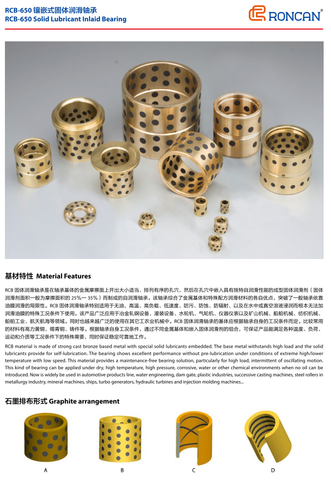 RCB650是通用的基礎(chǔ)產(chǎn)品,無論高壓、低壓、高溫、低溫、有油潤滑、無油潤滑還是水中潤滑。都能適用。產(chǎn)品的基體是高力黃銅,比一般的銅套硬度提高一倍。耐磨性能提高一倍以上。因此在冶金行業(yè)的連鑄機(jī)、軋機(jī)、輸送機(jī)上都可采用。還用于塑料注塑機(jī)鎖模機(jī)構(gòu),擠出機(jī)構(gòu)。高壓電的自動開關(guān),建筑機(jī)械的起吊支撐部位,以及水利樞紐工程的弧門支撐?;喓蛡鲃虞啿课弧_€有造紙機(jī)烘道、汽車模具、船舶起錨滑動部位等。